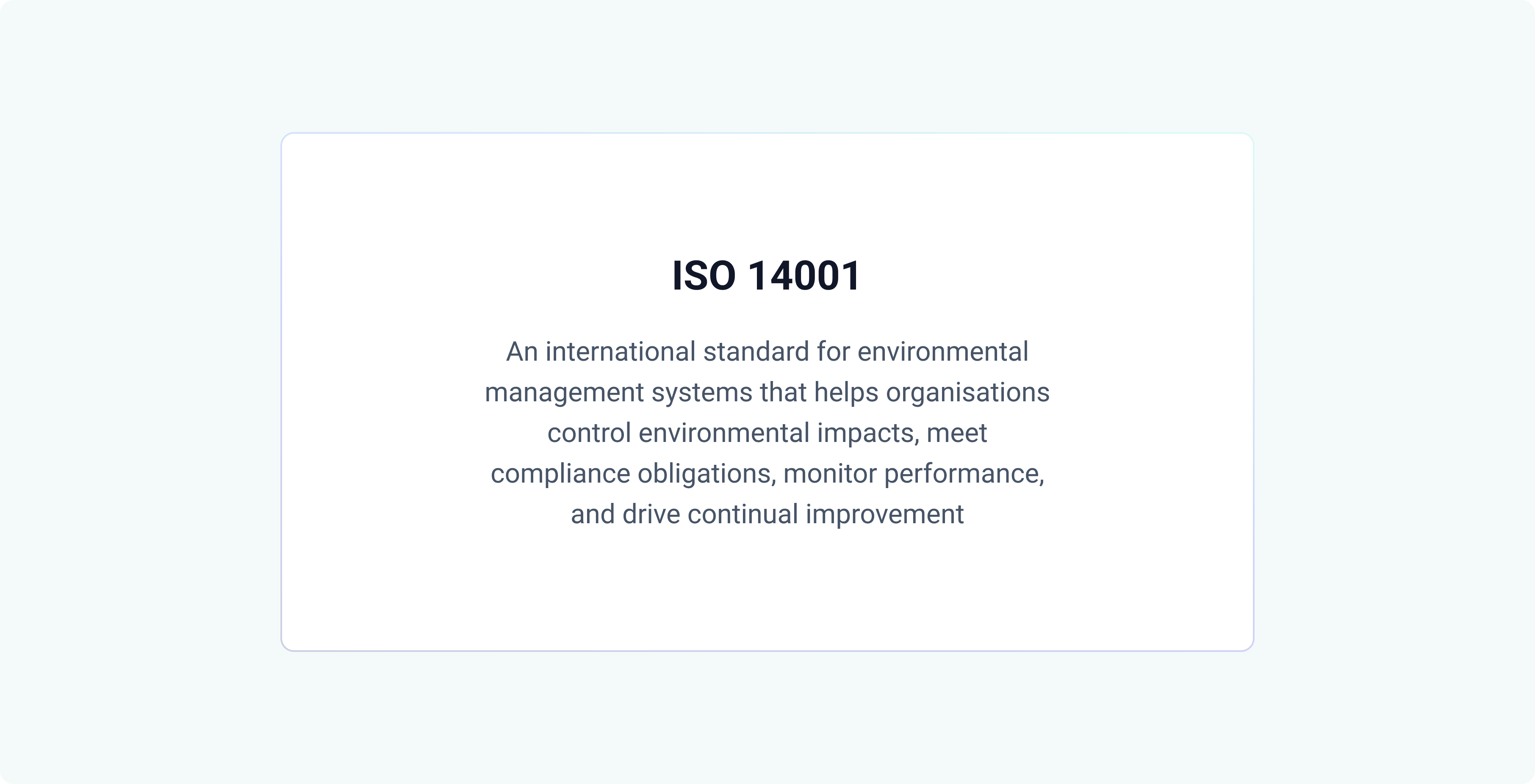 ISO 14001 is the internationally recognised standard for environmental management systems (EMS). It provides a framework for organisations to manage environmental aspects, meet compliance obligations, control operations, evaluate performance, and drive continual improvement.