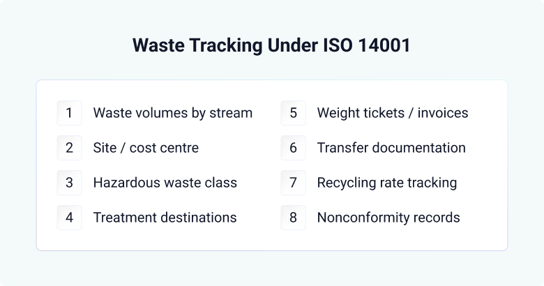 ISO 14001 does not prescribe a fixed set of waste metrics. In practice, organisations usually converge on a core set of data and supporting evidence because it enables both audit response and internal oversight.