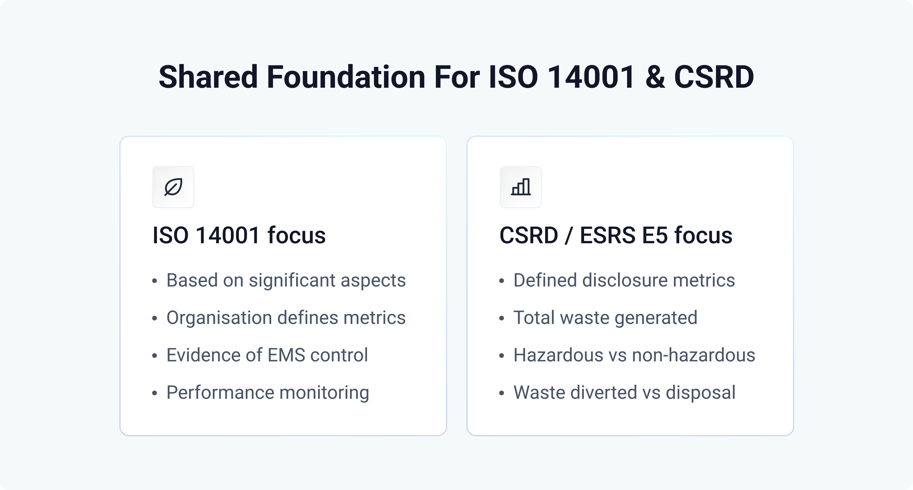 ISO 14001 and CSRD/ESRS both rely on traceability and evidence, but they standardise different things: