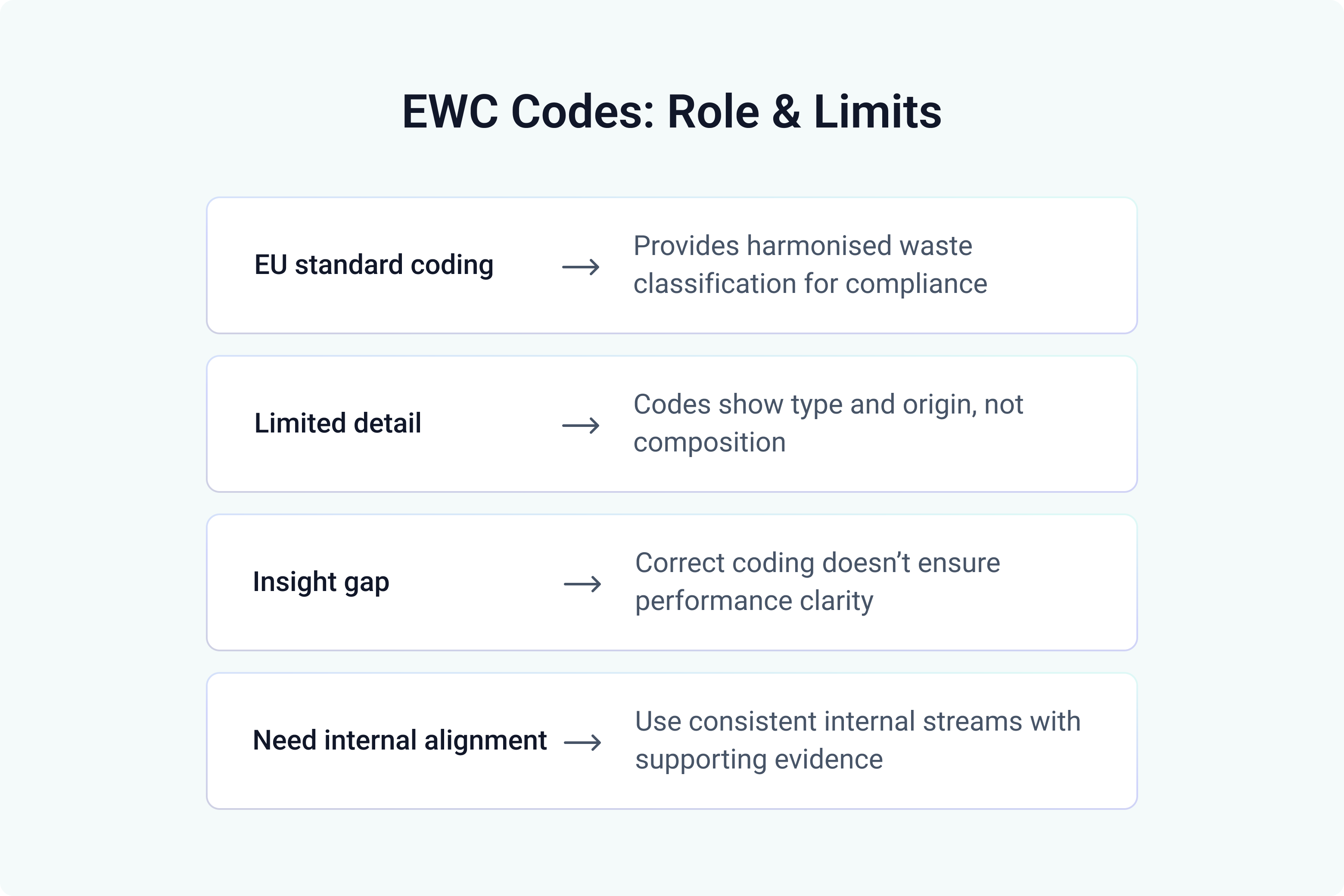 EWC codes support compliance but often lack detail on material composition and treatment suitability. Enterprise waste analysis adds internal stream definitions to enable meaningful comparison and optimisation.