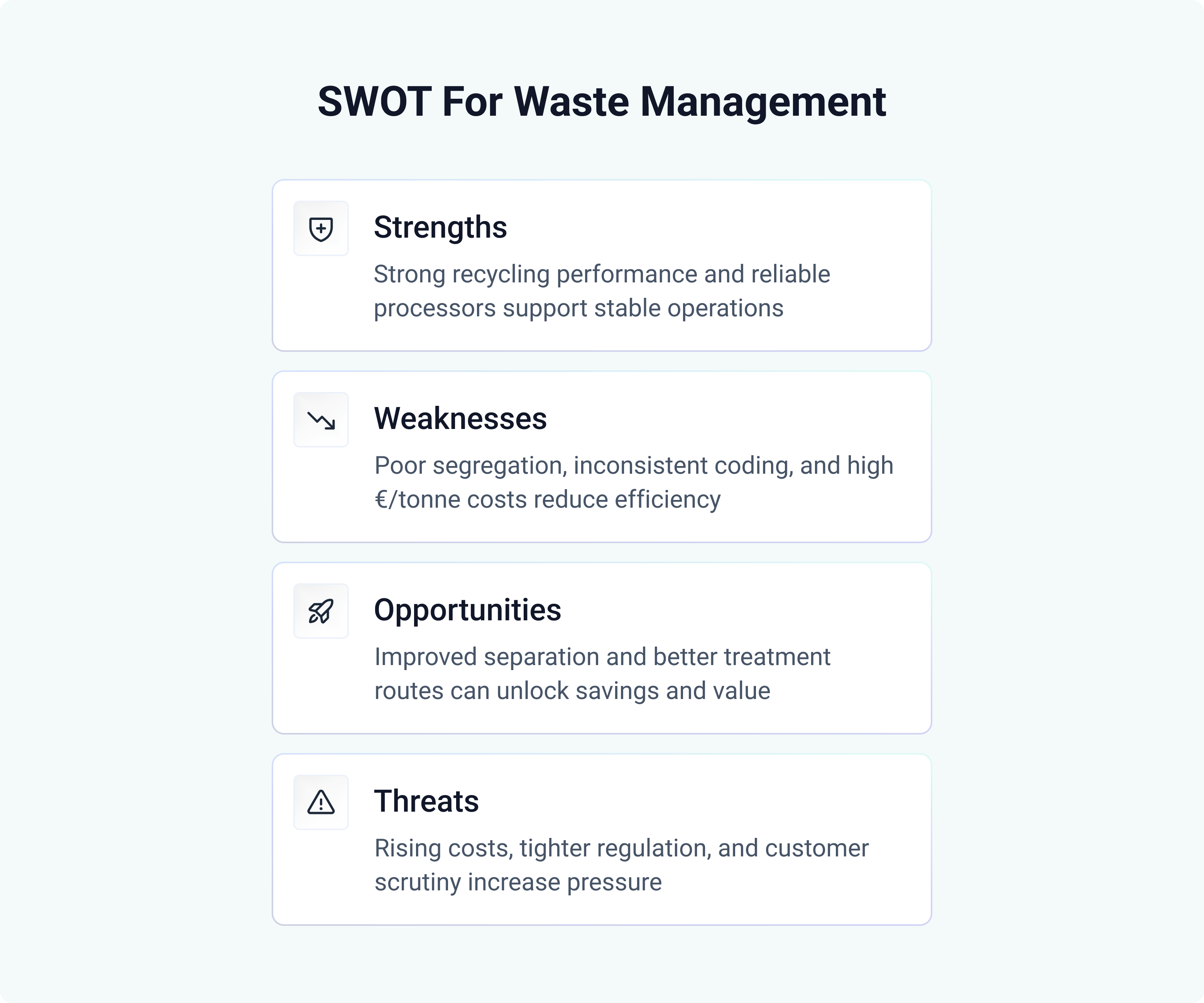 Once reliable analysis is in place, a SWOT analysis for waste management can help prioritise action. Below are some examples of what you might place in each quadrant of your SWOT analysis, depending on the state of waste management in your organisation.
