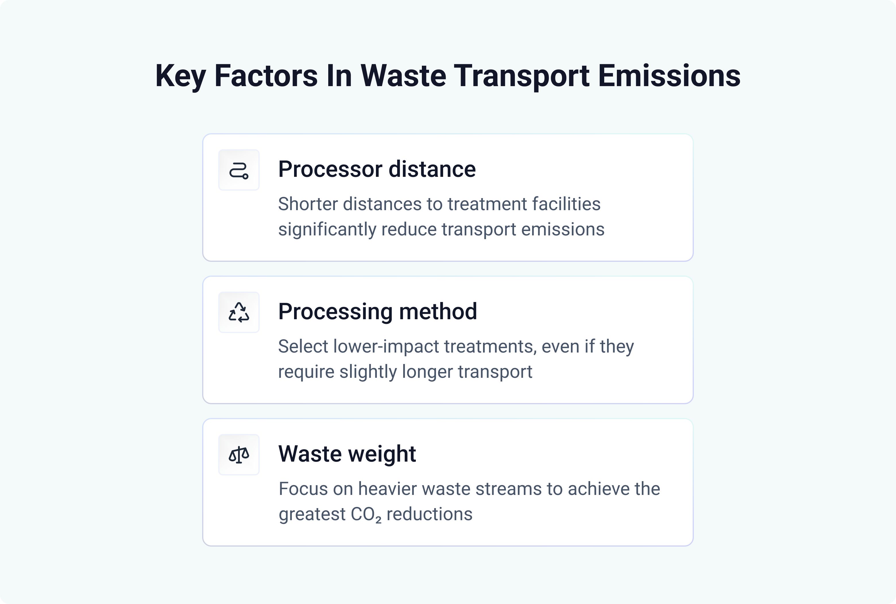 The most influential factor affecting transport emissions is the distance between the waste generation site and the processing facility. Choosing processors closer to where the waste is produced can drastically cut CO₂ emissions from transport and better utilize vehicle capacity. Whenever possible, prioritise local treatment options — especially for waste streams that are collected frequently or in large volumes.