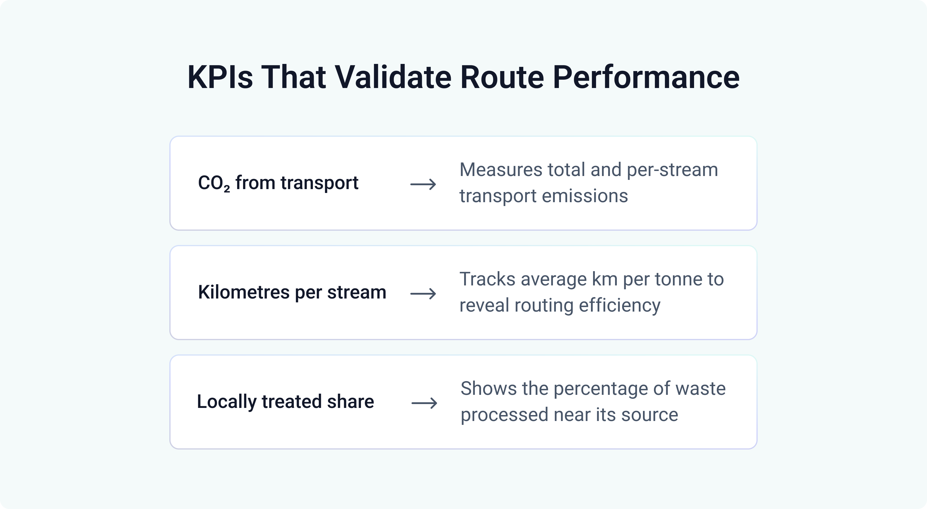 Once transport and treatment data become visible, you can start measuring what used to be a blind spot: the emissions and efficiency of their waste logistics. These three indicators provide a good overview of your overall route performance.